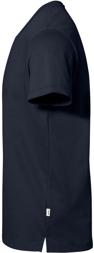 Funktionelles T-Shirt mit rundem Halsausschnitt, in edler Single-Jersey-Optik und Nackenband. Kragennaht und Innenseite der Seitenschlitze sind mit kontrastfarbigem Gewebeband belegt. Hergestellt durch ein spezielles Strickverfahren, bei dem zwei Garne zu einem HAKRO COTTON TEC®-Double-Face-Material verarbeitet werden. Dabei entsteht an der Außenseite eine besonders feine Single-Jersey-Oberfläche aus langstapeliger, gekämmter und ringgesponnener Baumwolle und an der Innenseite eine Mesh-Lage aus der Funktionsfaser TRIACTIVE. Dadurch ist das T-Shirt temperaturregulierend, weil Feuchtigkeit schnell an die Außenseite transportiert wird, wo sie verdunstet. Gedrucktes HAKRO Necklabel für höchsten Tragekomfort und gewebtes HAKRO Flaglabel an der linken Seitennaht.