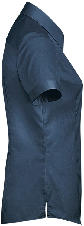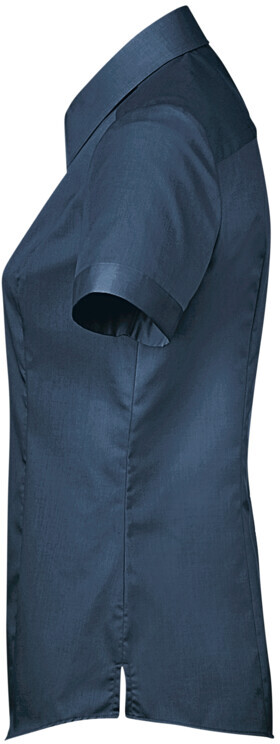 Kurzärmelige Bluse mit Kent-Kragen, leichter Taillierung durch Wiener Naht im Vorderteil und Abnäher im Rückenteil, leicht gerundetem Saum, modischer Paspel aus dunkelblauem Satin an der inneren Kragennaht, hochwertig und schmal verarbeiteter Knopfleiste, doppelter Schulterpasse, Ärmeln mit gestepptem Aufschlag, 4-Loch-Knöpfen Ton-in-Ton - über Kreuz vernäht und doppelt verknotet für extra festen Halt -, Ersatzknopf und Seitenschlitzen. Hergestellt aus formstabilem, strapazierfähigem und bügelfreiem Baumwoll-Popeline. Gewebtes HAKRO Necklabel aus hochwertigem Kettsatin mit weichen, ultraschallgeschnittenen Bandkanten für höchsten Tragekomfort.
